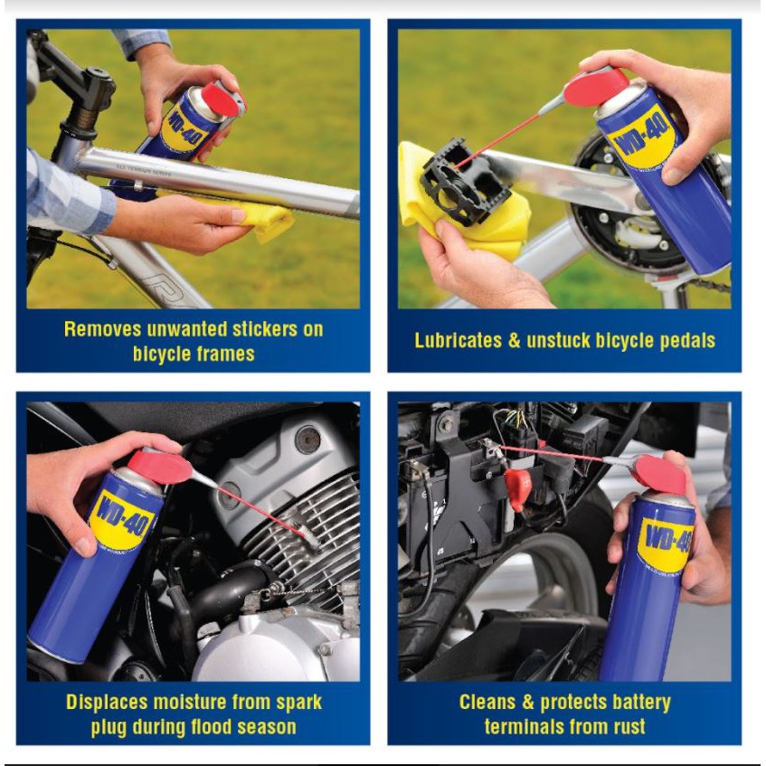 WD-40® Multi-Use Product lubricates moving parts such as hinges, wheels, rollers, chains and gears. It protects against rust and corrosion on items like tools and sporting equipment. It penetrates to free stuck corroded parts like nuts, bolts, valves and locks. It quickly removes adhesives, corrosion and paint. It displaces moisture to restore water flooded equipment such as engines, spark plugs and power tools.